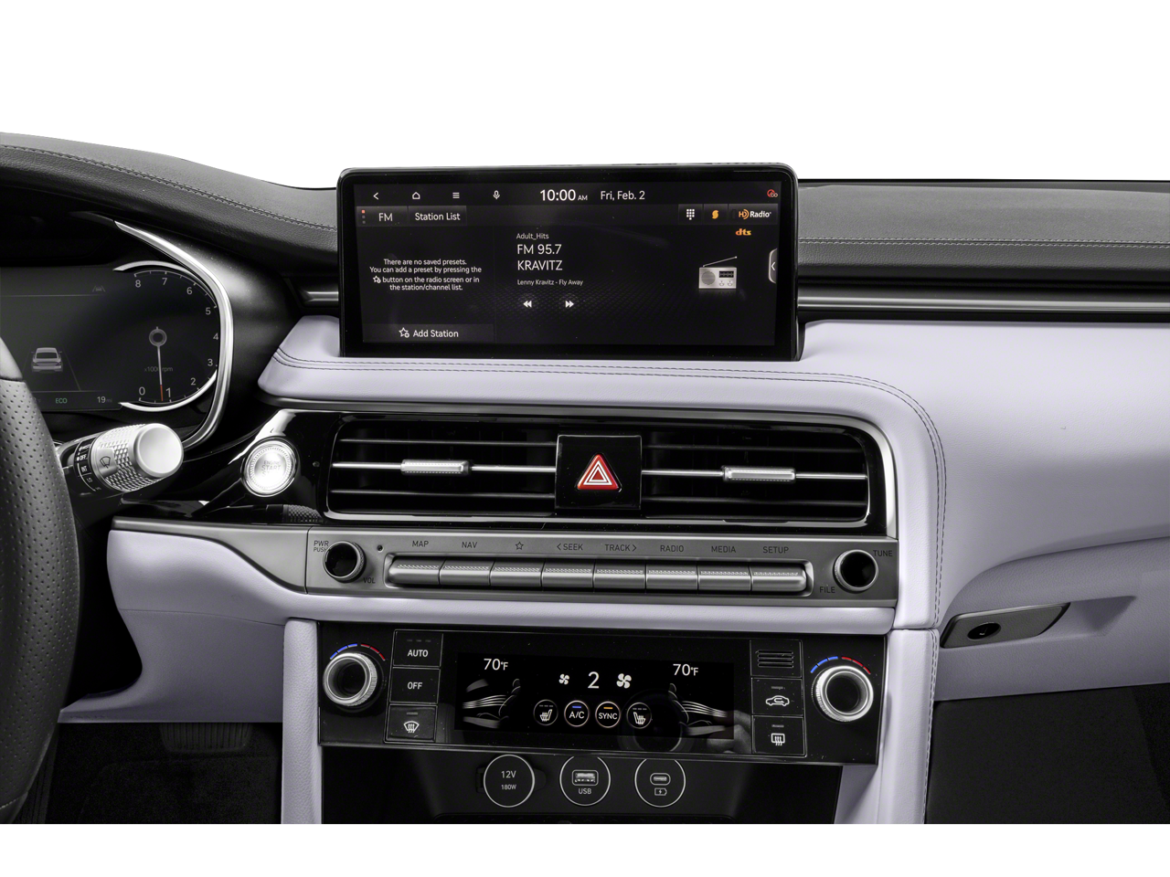 - Radio: AM/FM/SiriusXM/HD Audio System -inc: 6 speakers, 5th generation navigation system w/10.25" touchscreen, dynamic voice recognition, connected routing, over the air updates, Android Auto and Apple CarPlay, SiriusXM Radio w/90-day trial subscription (not available in Alaska or Hawaii), Genesis connected services, Bluetooth® hands-free phone and audio streaming system and 3 USB ports